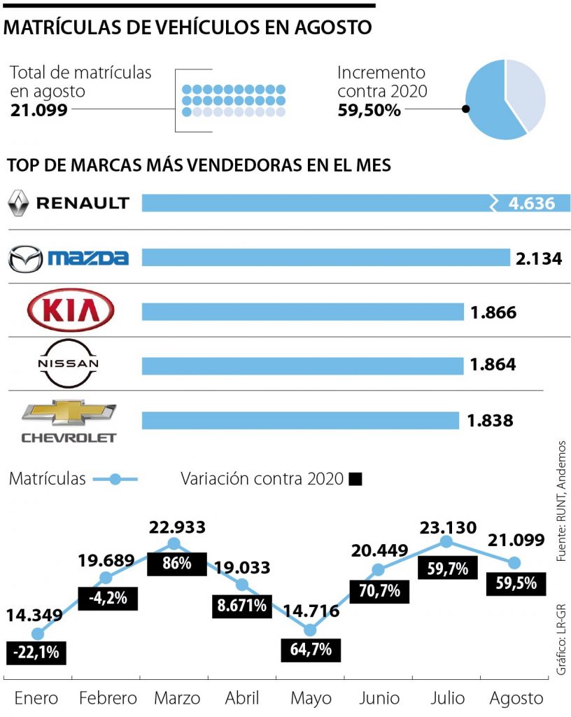 El mercado automotor ha seguido mostrando signos de recuperación frente al año más grave de la pandemia. De acuerdo con cifras de Andemos, en agosto se matricularon 21.099 vehículos nuevos, lo que representó un crecimiento de 59,5% frente a las cifras de 2020.